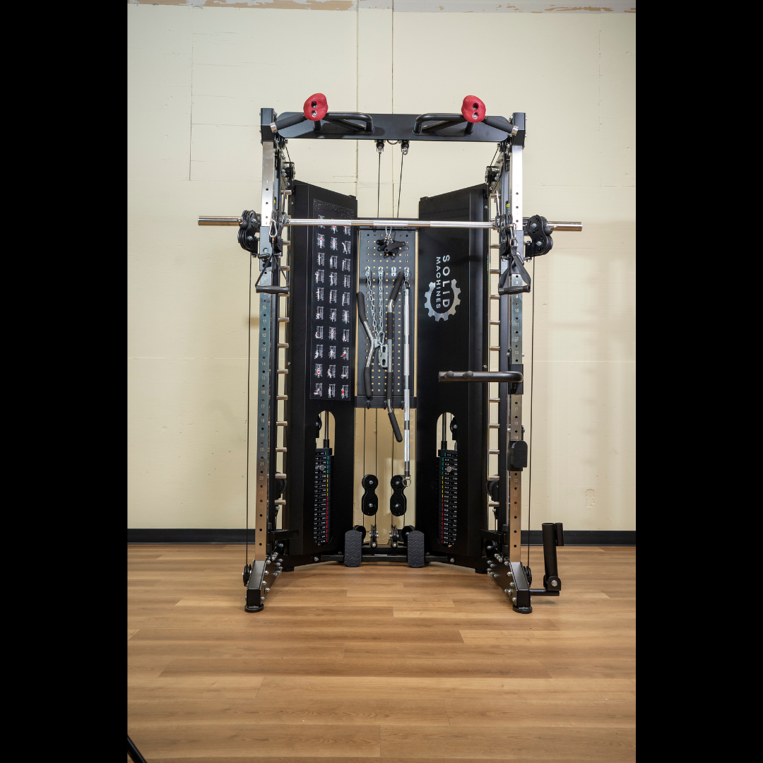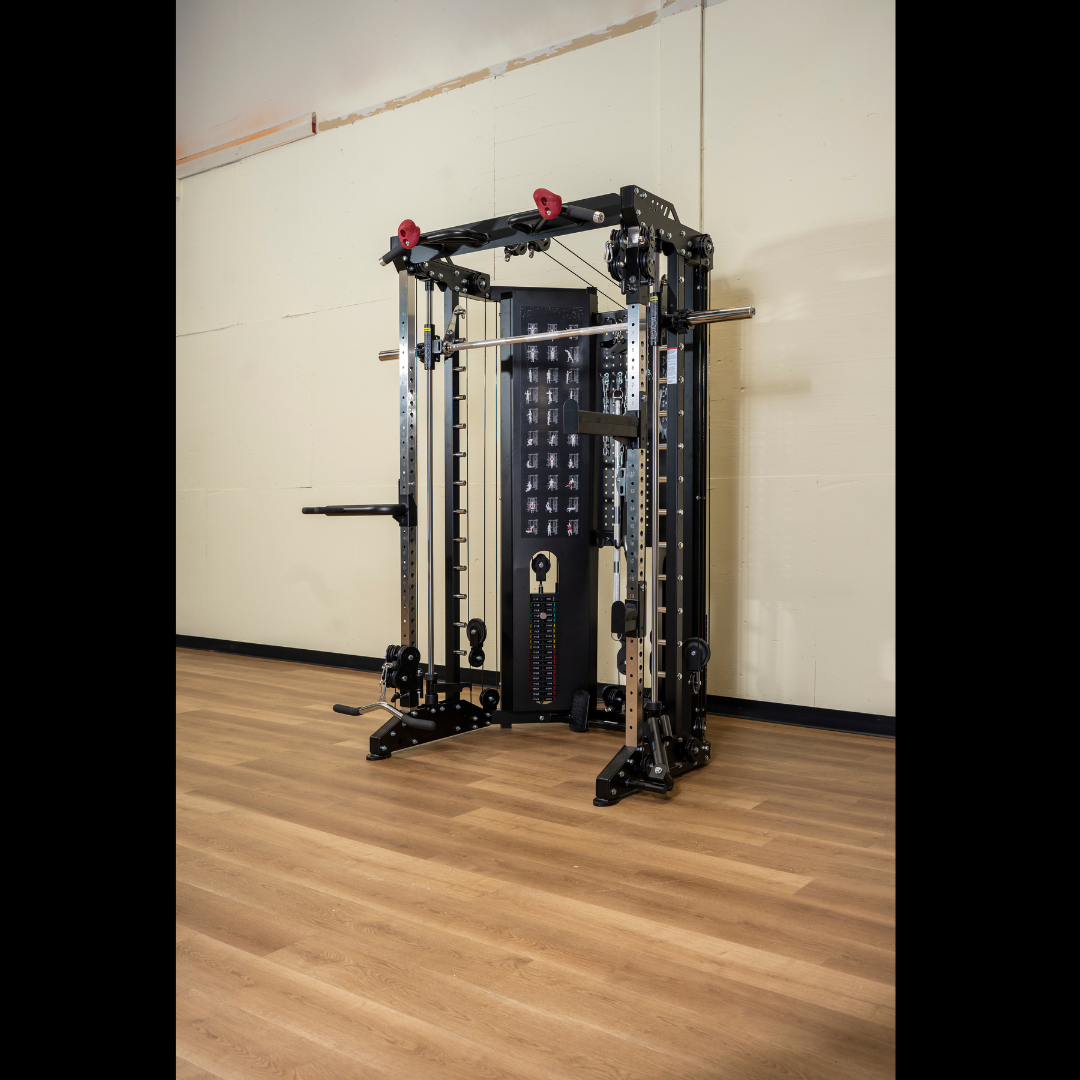 Train smarter and safer with this high-performance Smith Machine, built for smooth motion and total-body versatility. Built with individual 198 lb weight stacks, with a 1:1 and 1:2 pulley ratio and a 1:1 rowing pulley for precise resistance control.